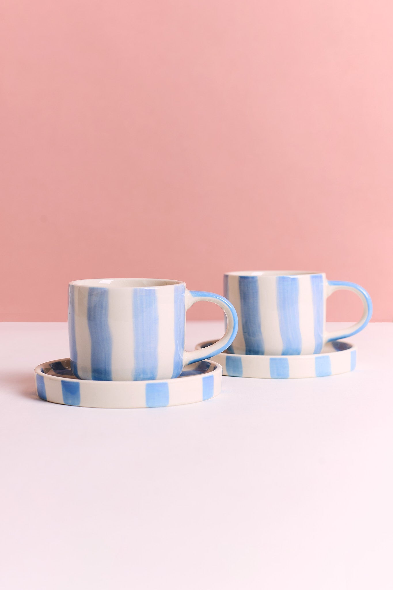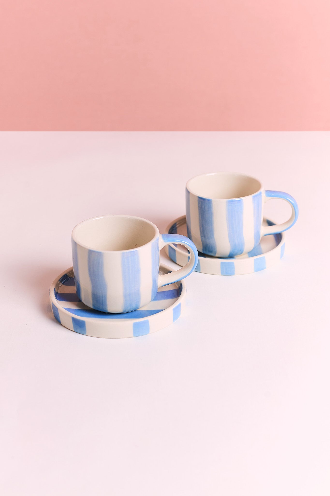 Enjoy your Italian espresso in style with this handcrafted ceramic set, including 2 cups and 2 saucers (4 pieces total). Each piece is unique, hand-painted with care, and perfect for a small snack with its flat saucer surface.