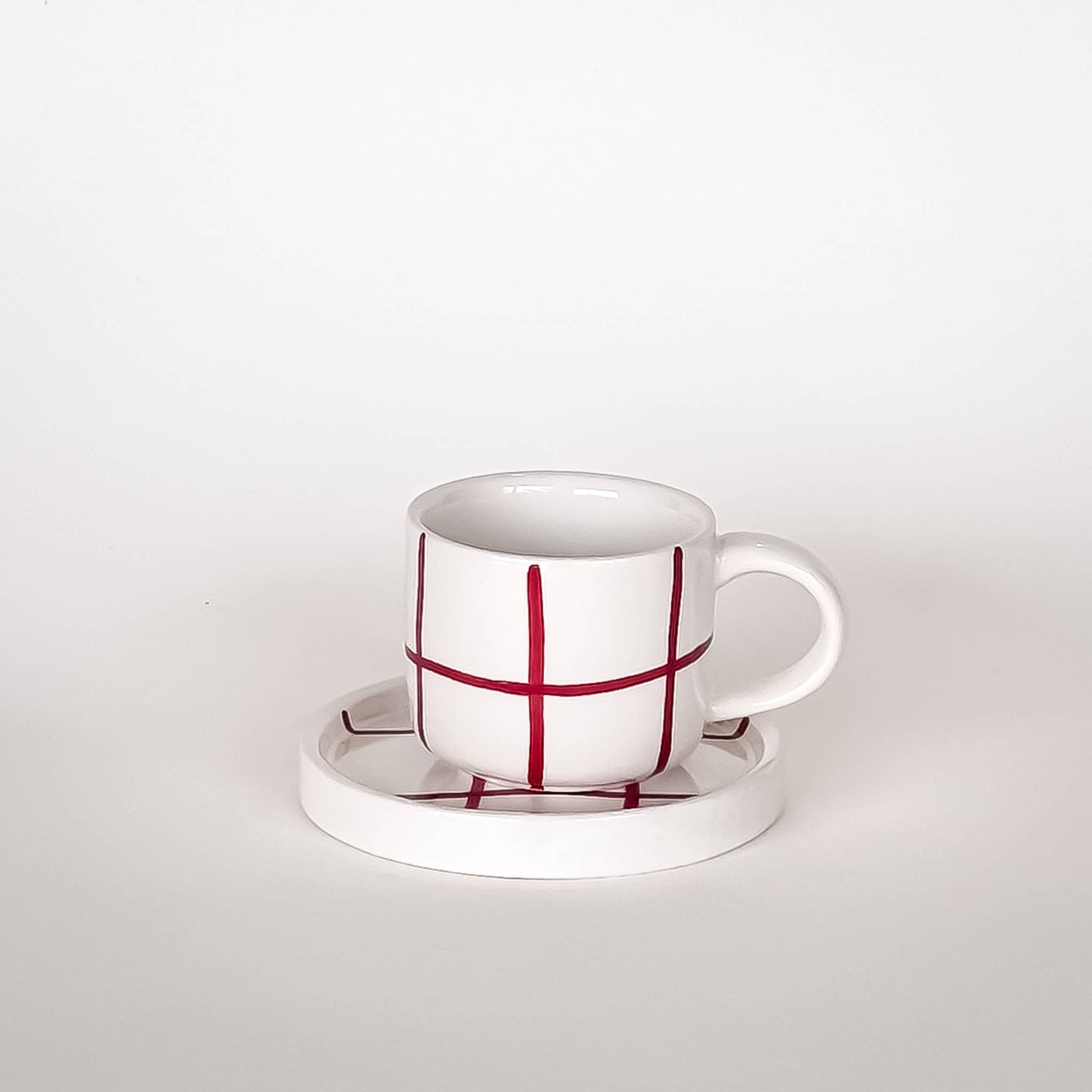 Espresso Grid in bold red—two handcrafted ceramic cups with matching saucers. Each piece is uniquely hand-painted with striking vertical and horizontal lines. The compact cups (6 cm diameter, 5.5 cm height) pair perfectly with flat saucers ideal for small bites. Mix and match with our Stripes Collection for endless styling possibilities. Dishwasher safe, microwave friendly, and food safe. Sustainably packaged.