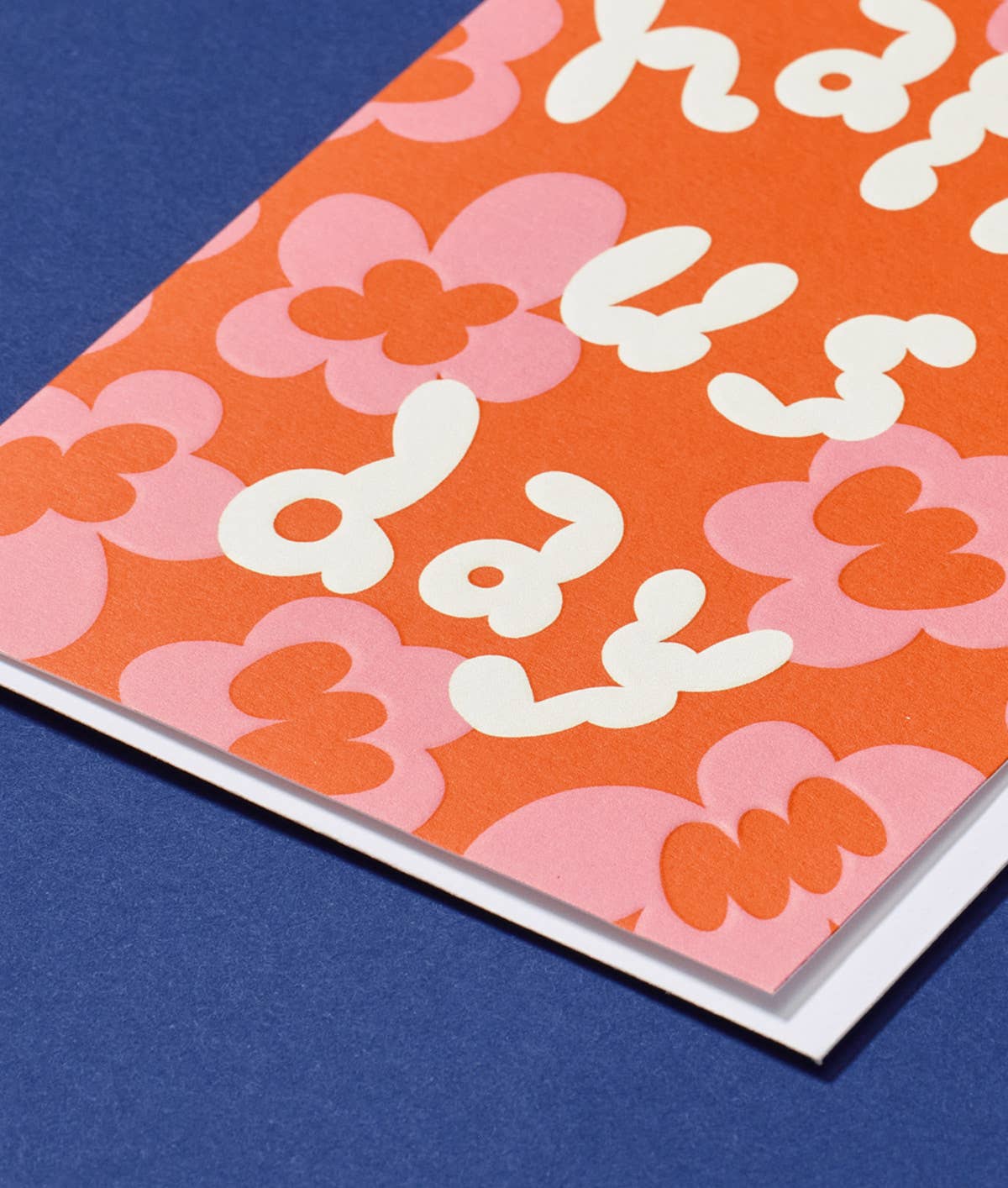 Happy birthday wishes in bold, playful type on a vibrant pink card. Designed by Micke Lindebergh for Wrap, this 10.9cm × 15.5cm greeting arrives with a white envelope in eco-friendly packaging. Blank inside for your personal message. Printed in the UK on sustainable paper with vegetable-based inks.